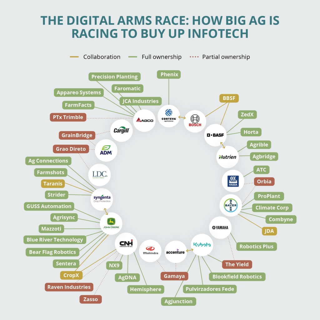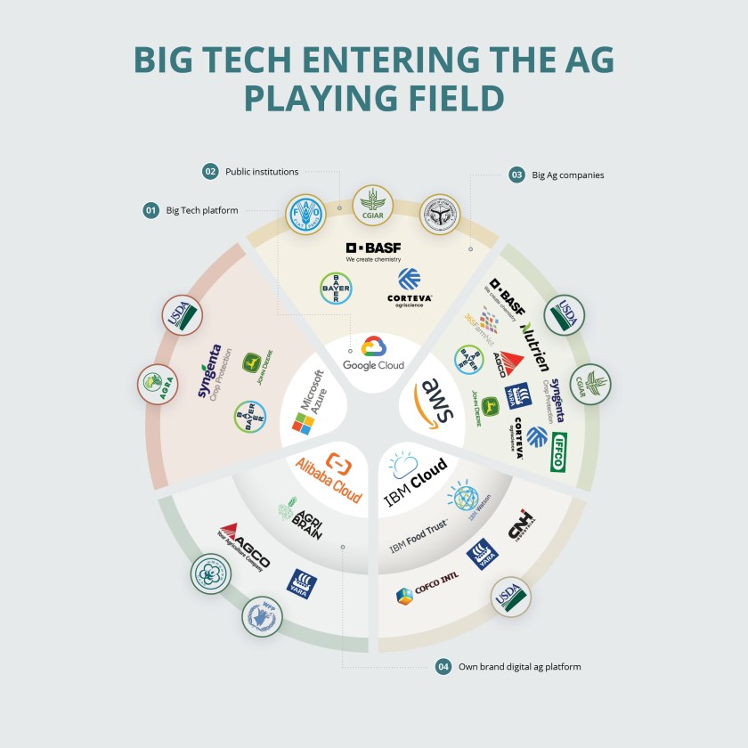 Across multiple regions, major technology companies, including Amazon, Microsoft, Google and Alibaba, have joined forces with agribusiness giants in seeds, agrochemicals and farm machinery. The result is an increasingly integrated digital infrastructure that reaches into every layer of industrial farming.