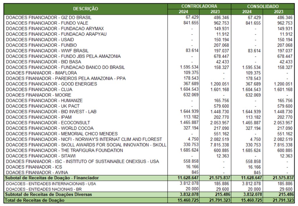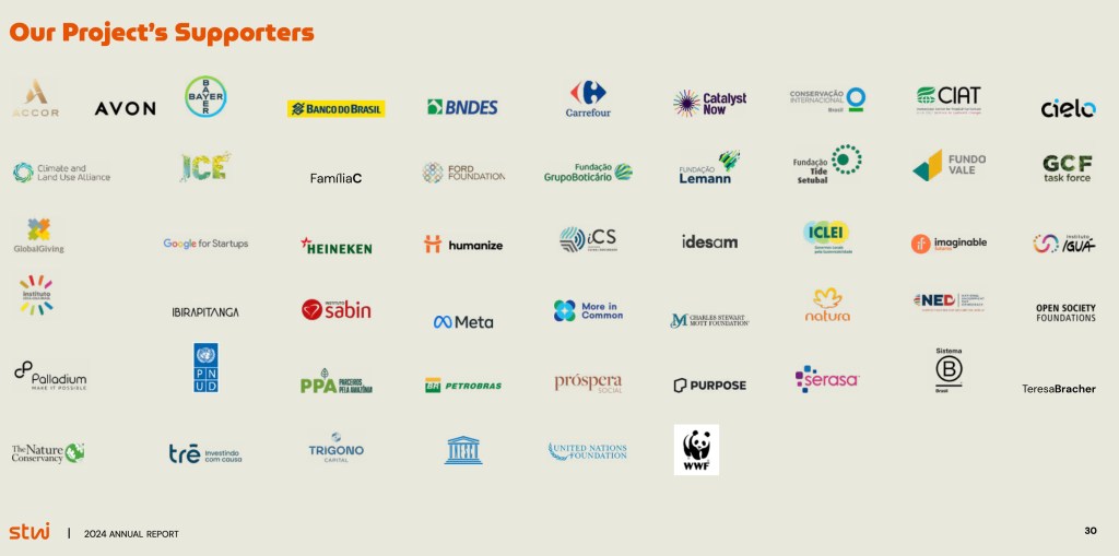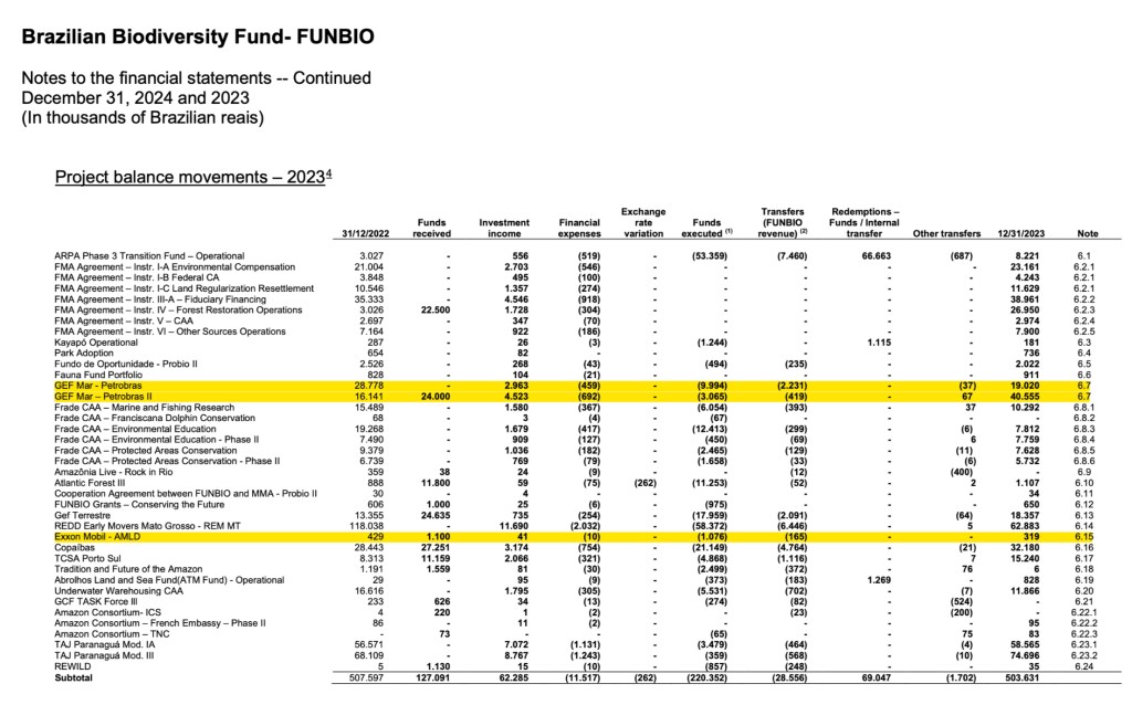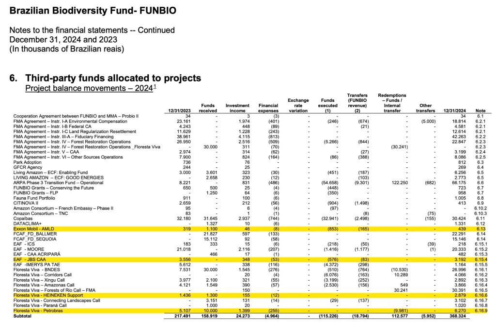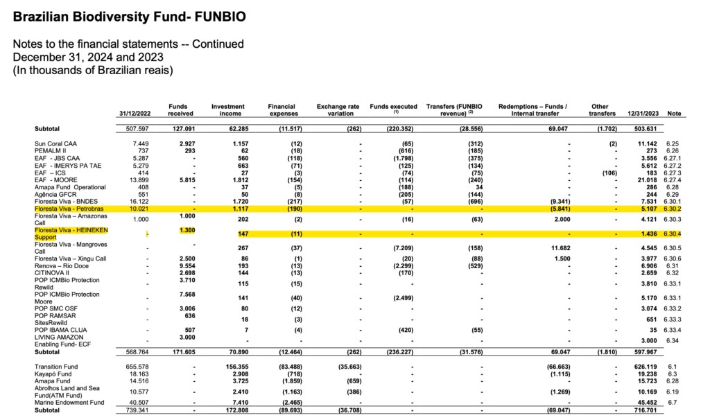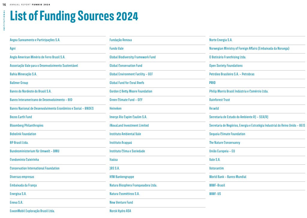 Financial disclosures illustrate the breadth of this network. FUNBIO linked programmes have involved funding and partnerships with entities including BNDES, KfW, IDB, the Gordon and Betty Moore Foundation, WWF, the Good Energies Foundation, CLUA, Bezos Earth, Petrobras, Eneva, ExxonMobil, Chevron, Vale, Anglo American, Natura, JBS, Heineken and others, spanning public, private and philanthropic domains.