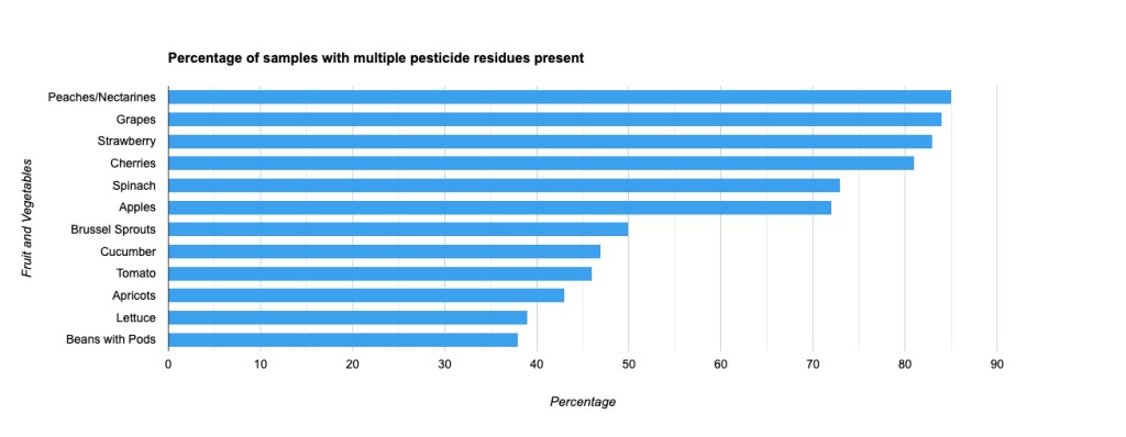 According to PAN UK’s findings, there seems to be a rising trend in the occurrence of pesticide combinations in the food consumed by Britons. The total percentage of fruit and vegetables with residues from multiple pesticides has consistently stayed below 48%, but this year it unexpectedly spiked to an astonishing 53%.