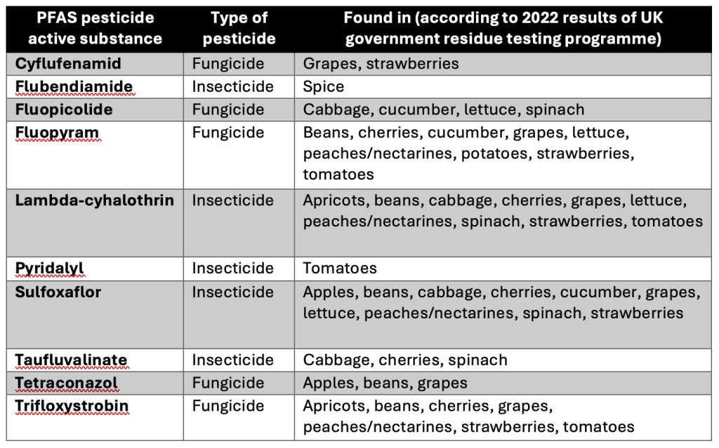 As per PAN UK’s analysis of the latest testing results from the UK Government Expert Committee on Pesticide Residues in Food (PRiF) in 2022, the 10 PFAS pesticides identified in UK food were as follows: